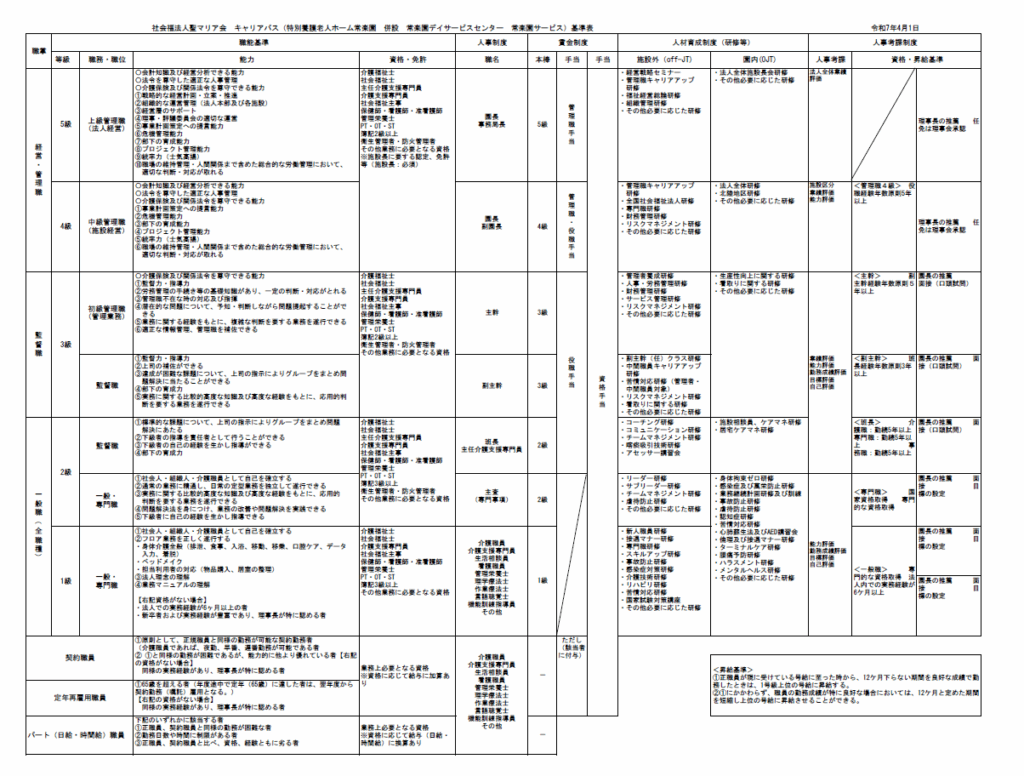 「できることを増やす」「自信を持って働く」「次の目標に進む」ことをサポートしています。以下のキャリアパス表では、介護職員を中心に、各段階で求められるスキルや役割、研修内容などを明確にしています。